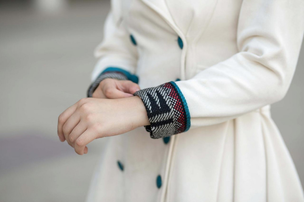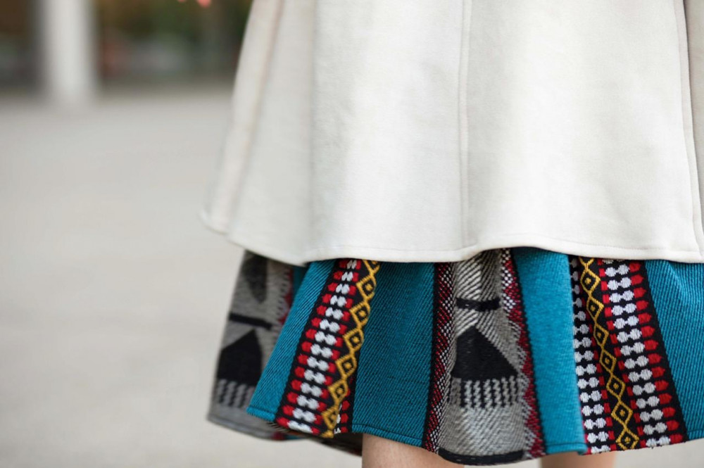 فستان من الشامواه الخفيف بلون الاوف وايت ومزين بقماش السدو التراثي الوطني
