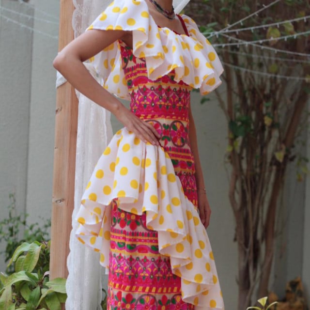 تم دمج قماش الموضه المنقط لفصل الصيف مع القماش المطرز الهندي لنحصل على قطعه مميزه ، قطعه تناسب الأعمار الحائره والكبار بأسلوب ناعم
